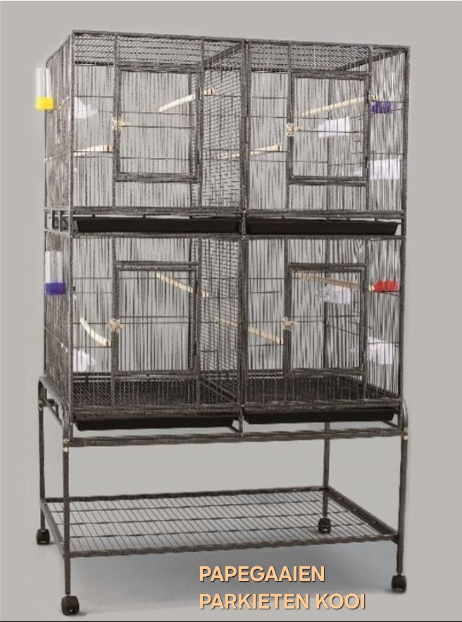 Deze mooie kamer voliere is geschikt voor meerdere vogel soorten, van kanaries tot grote papegaaien. Met 4 compartimenten, handig om kweek vogels apart te houden of uw jongen te plaatsen. Mogelijkheid om van de 4 kooien, 2 kooien te maken door uitschuifbare tussen tralies.