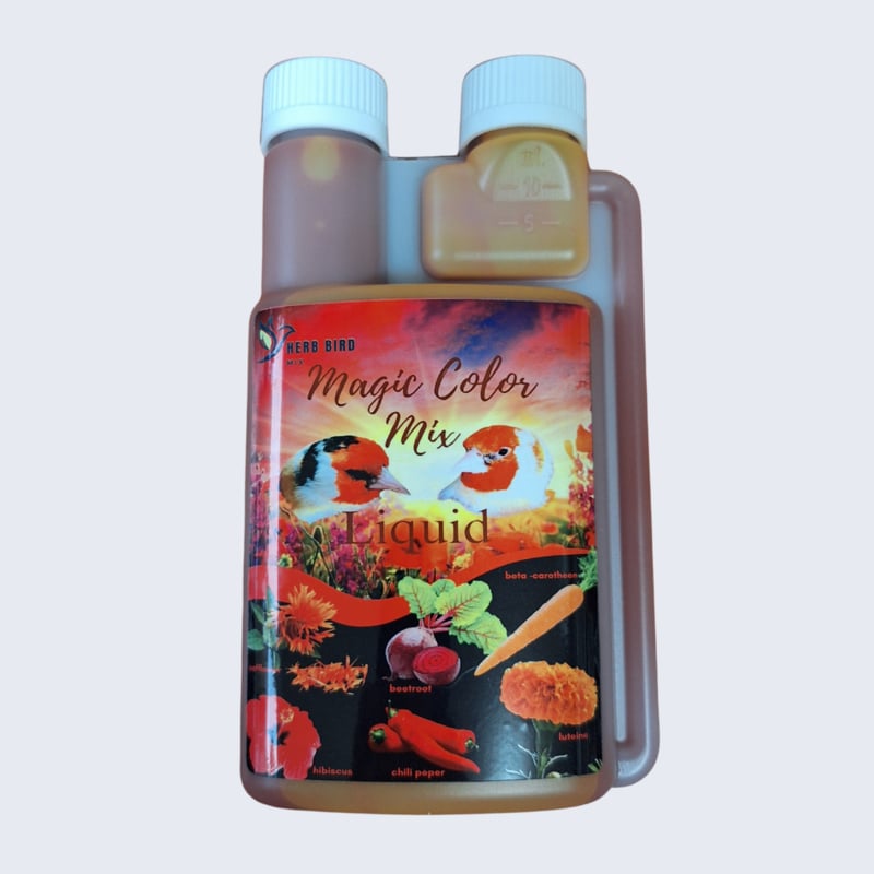 Magic Color Mix Liquid bevat een mengsel van 100% natuurlijke kleurstoffen. Zonder enige vorm van chemische toegevoegde kleurstoffen wat schadelijk is voor de lever van de vogels. Deze natuurlijke carotenoïden zorgen voor een diepe intensive kleur bij u vogels. ideaal om het masker van de distelvinken mooi dieprood te kleuren.