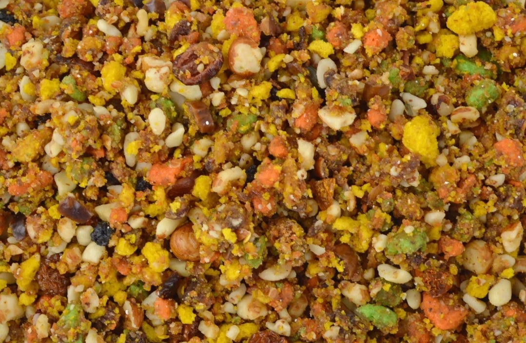 BRAVO FRUIT MIX GROF,ย heerlijke mengeling voor grote parkieten en papegaaien. Bevat gedroogde vruchten, noten en ook pepers.