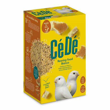 CéDé® Opfokvoer Eivoer Patee Bianco is een aanvullend voer voor witte, lichtgekleurde en mozaïek kanaries. Bij deze vogelsoorten moet een doorkleuring van het verenkleed worden vermeden. CéDé® opfokvoer Bianco heeft een hoger gehalte vitamine A, omdat recessief witte kanaries dit zelf minder goed kunnen aanmaken. CéDé® opfokvoer Bianco bevat hoogwaardige eiwitten, alle noodzakelijke vitaminen, aminozuren, mineralen en sporenelementen voor een succesvolle kweek. De toevoeging van essentiële aminozuren bevordert de rui.