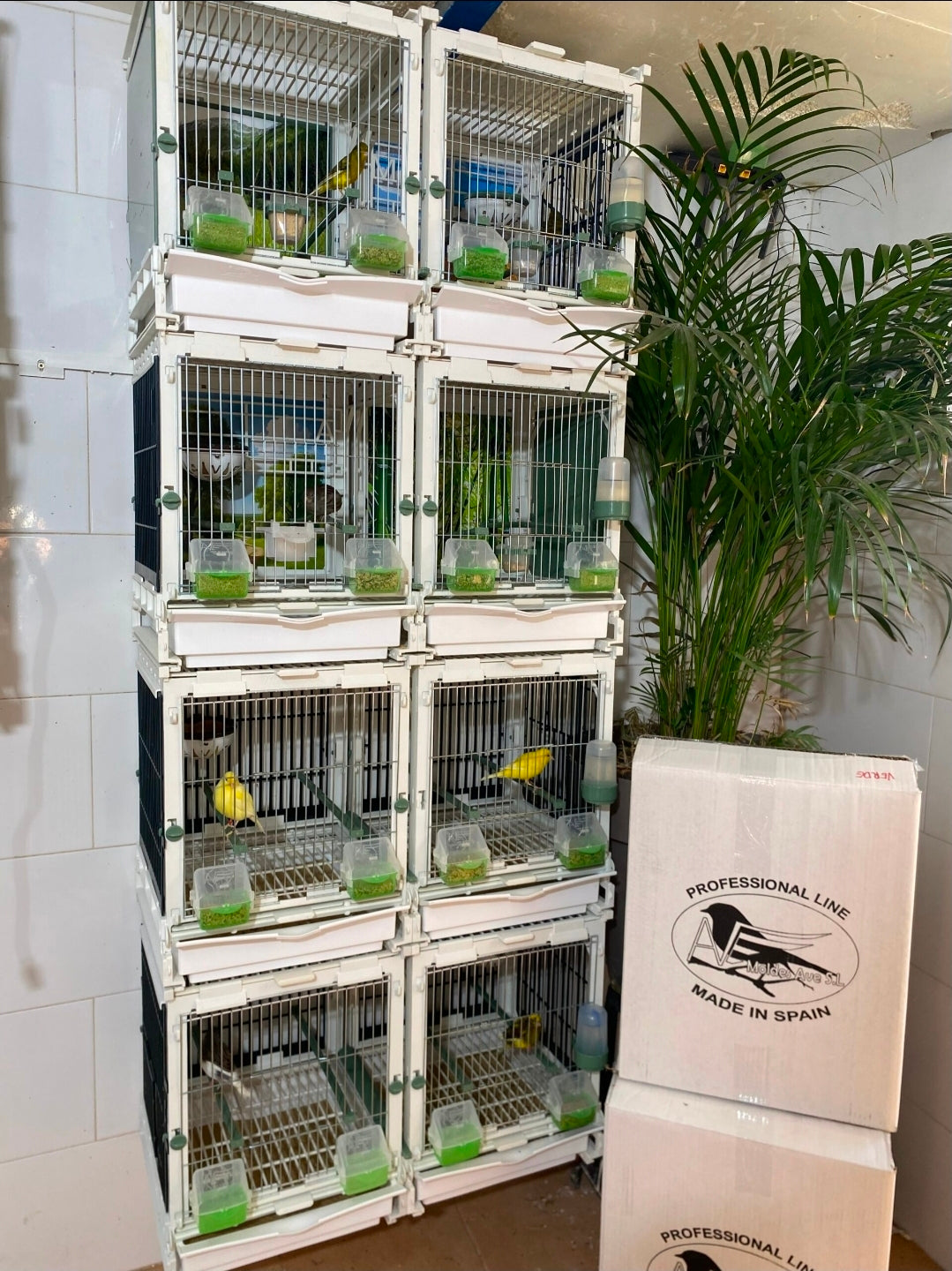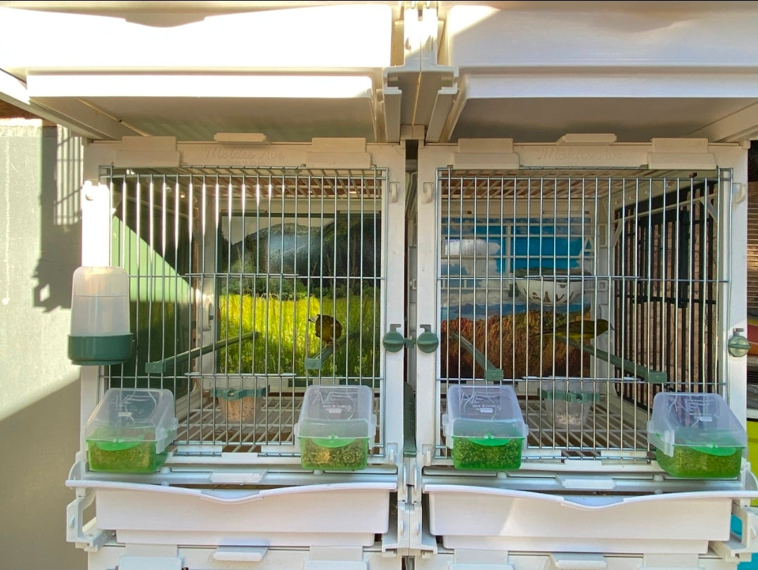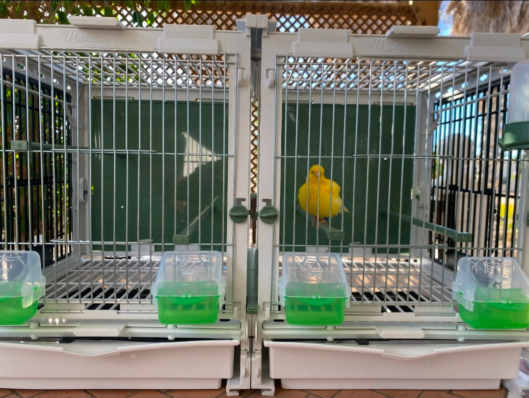 Samenstelling: twee kooien, elke kooi bestaat uit twee martervoederbakken, een drinkfontijn, een voorrooster van gegalvaniseerd staal, een gladde scheidingswand, een zijrooster met deur, een zijrooster, een uitneembare lade, een bodemrooster, een muursteun, 2 zitstokken, kooiverbindingssloten en kooigeleiderafdekking.