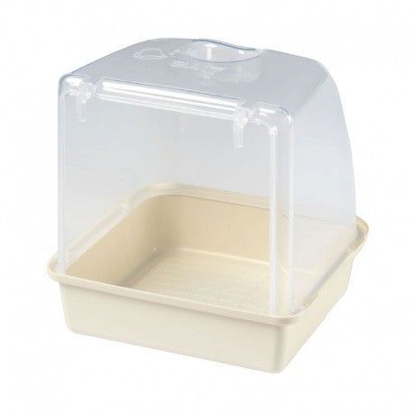 Bad van STA Soluzioni geschikt voor kweekkooien en kleine voliรจres, gemaakt van gebruikelijk plastic en ontworpen om waterspatten te voorkomen. Aan de bovenkant heeft hij een speciaal gat waardoor hij gevuld kan worden zonder hem van de kooi los te maken.
