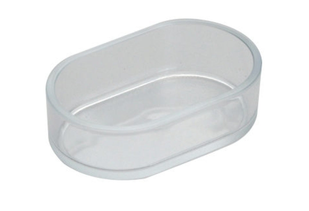 De ovalen eetpot plaats je best op de grond. Het is uit kunststof vervaardigd en daardoor gemakkelijk afwasbaar