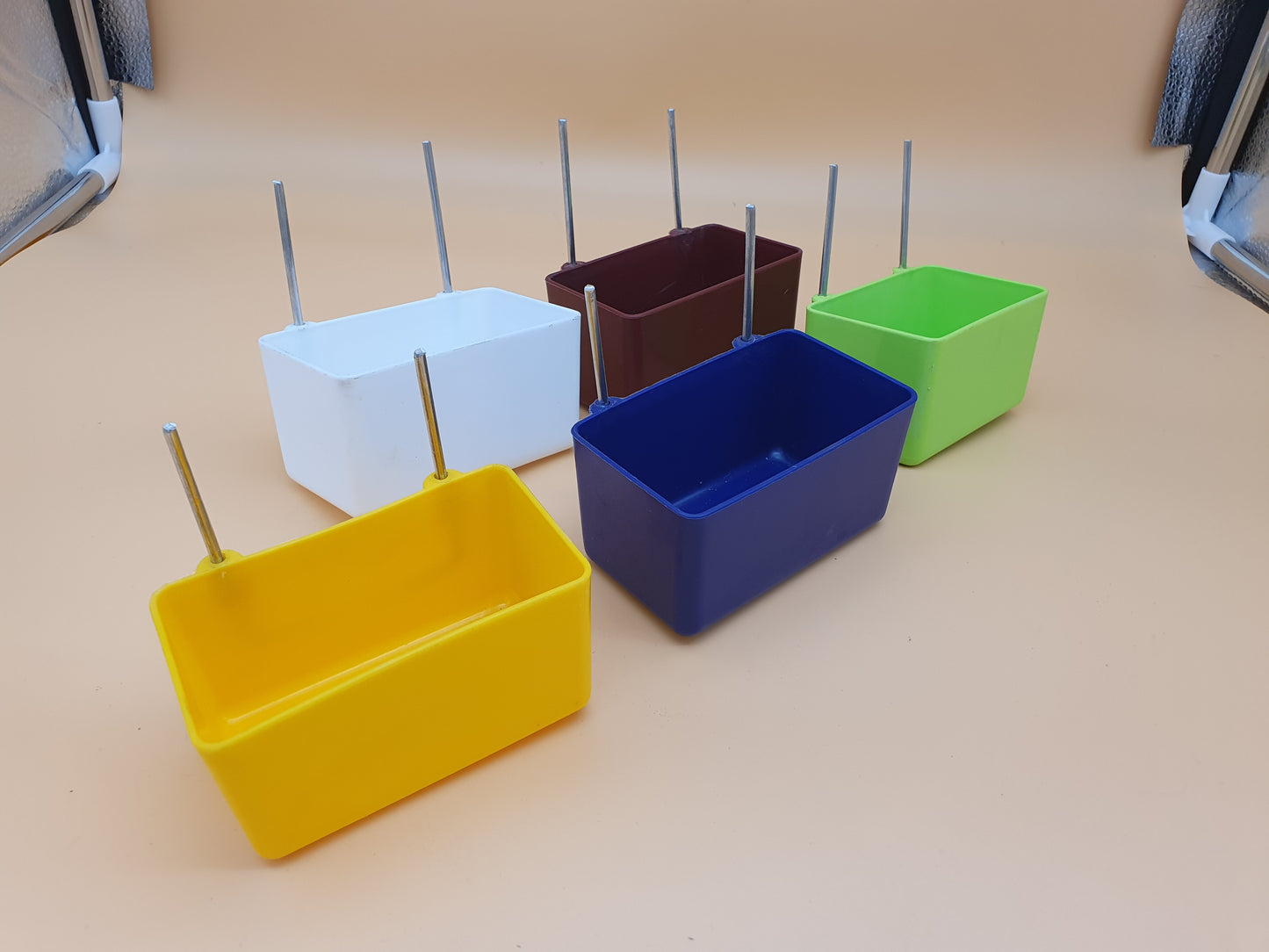 Handige plastieke eetpot met buigbare haken in metaal. Verkrijgbaar in verschillende kleuren, met bijhorende Anti-Mors systeem. Kan gebruikt worden in kooien of volières naar wens.